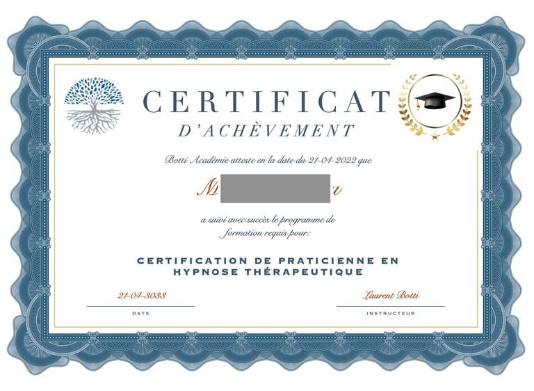 Botti Académie est un organisme reconnu d'état par le ministère du Travail en France, autorisé à délivrer des certifications en hypnose thérapeutique. Pour l'obtenir, un élève doit avoir suivi un minimum de 5 modules complets dans l'année. Il lui est ensuite demander de réaliser un mémoire d'étude de cas, rédigé puis présenté à l'oral lors d'un module spécial "Certification".
